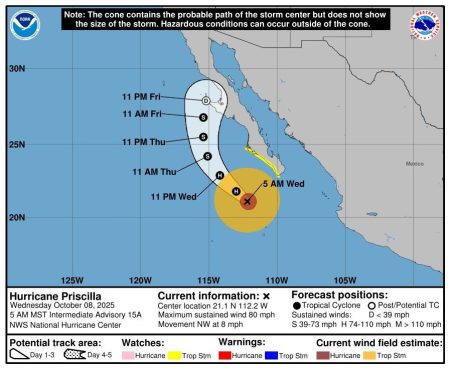 Prevalecerán lluvias extraordinarias (mayores a 250 milímetros [mm]) en Jalisco y Nayarit; torrenciales (de 150 a 250 mm) en Colima, e intensas (de 75 a 150 mm) en Michoacán, así como oleaje de 5 a 7 metros de altura en las costas de Jalisco y de 3 a 5 m en el litoral de Colima y Nayarit.