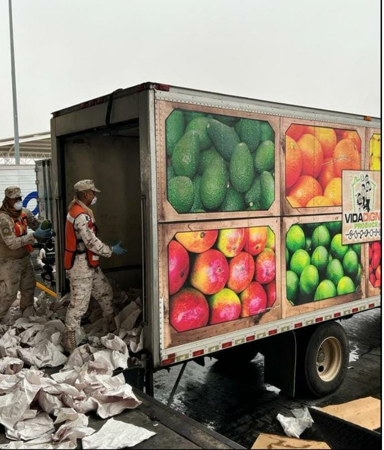 Personal del Ejército Mexicano e integrantes de la Guardia Nacional, desplegados en el puesto de revisión de Querobabi, llevaron a cabo la revisión de la unidad por medio de equipo de rayos gamma Full Scan, localizando 577 envoltorios de plástico en la carga que transportaba el vehículo, mismos que en su interior contenían: