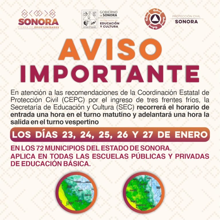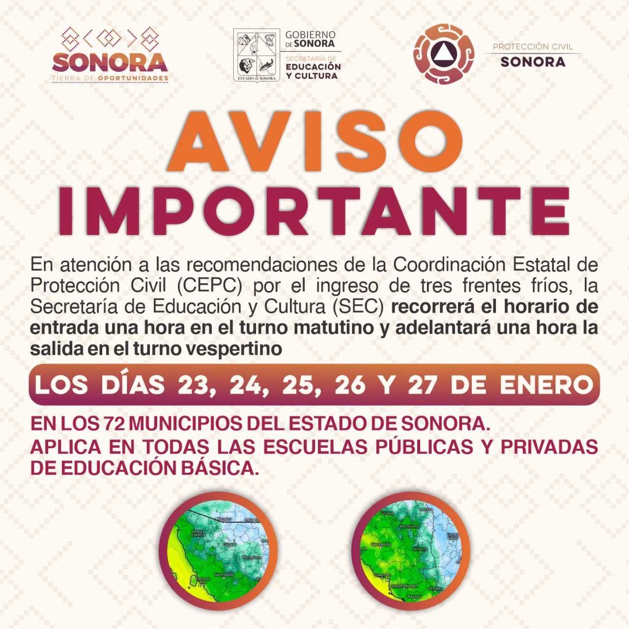 Por recomendación de la Coordinación Estatal de Protección Civil (CEPC), del 23 al 27 de enero se recorrerá una hora el horario de entrada en el turno matutino y se adelantará una hora la salida en el turno vespertino, en todas las escuelas públicas y particulares de nivel básico de la entidad, anunció Aarón Grageda Bustamante.