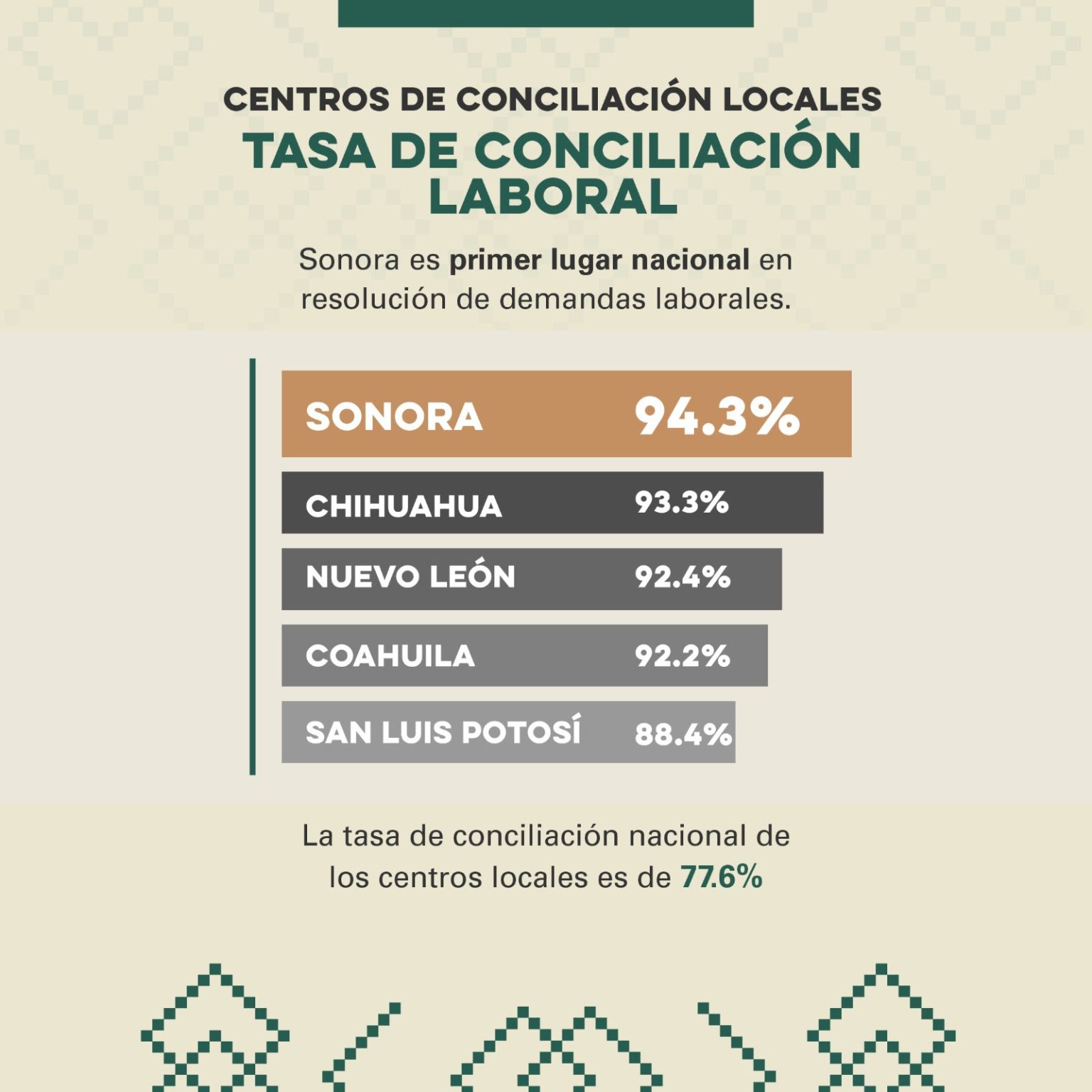 El secretario del Trabajo en Sonora explicó que, según la clasificación, los mejores resultados los ha tenido Sonora, con un 94.3 por ciento de conciliación; Chihuahua, con un 93.3 por ciento; y Nuevo León, con 92.4 por ciento.
