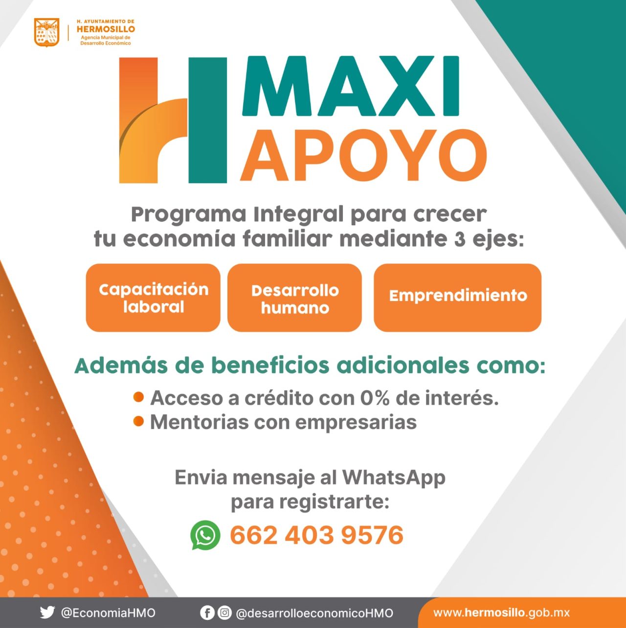 Agraz Boeneker comentó que ya está abierto el registro para las personas interesadas a través del número de WhatsApp 6624-039576 o se pueden preregistrar desde la liga https://hmo.digital/registromaxiapoyo