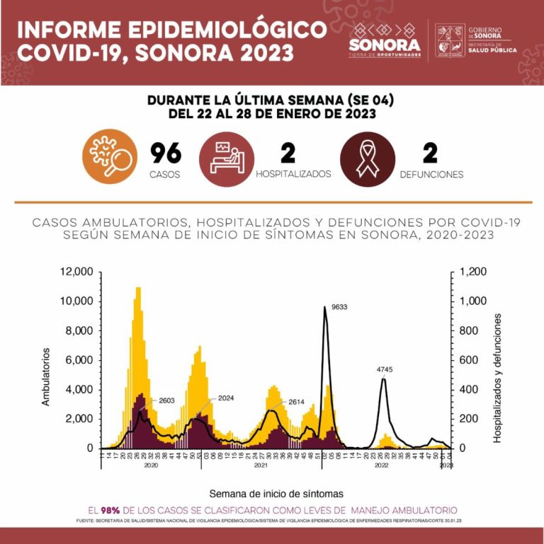 La Secretaría de Salud (SSA) confirmó 96 casos más de Covid-19 y dos defunciones a causa de la enfermedad, esto en la semana epidemiológica (SE) 4, que abarca del 22 al 28 de enero.