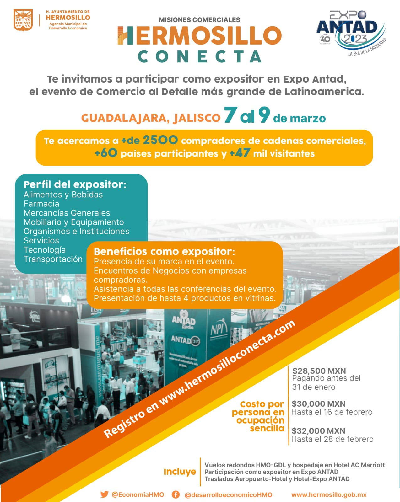 La invitación sigue abierta para participar como parte del programa Hermosillo Conecta de la AMDE en la Expo ANTAD, donde se reunirán alrededor de 47 mil personas de 65 países interesadas en realizar transacciones comerciales.