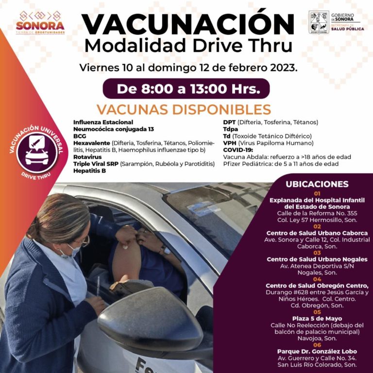 La Secretaría de Salud (SSA) del Gobierno de Sonora acercará servicios de vacunación general, en modalidad de servicio al auto o “drive thru”, en Hermosillo, Caborca, Navojoa, Ciudad Obregón, San Luis Río Colorado y Nogales.