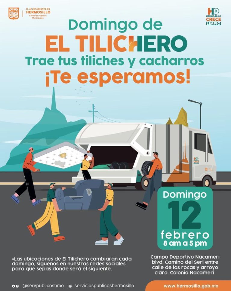 Pavlovich Escalante explicó que en la unidad deportiva ubicada en el bulevar Camino del Seri, entre calle las Rocas y Arroyo Claro, de las 8:00 a las 17:00 horas estará personal de la dependencia con una lona alusiva que indica que se recibe cualquier tipo de tilichero doméstico: residuos, muebles y cacharros que no se lleva el servicio de recolección de basura habitual. En las jornadas del tilichero no se recibirá escombro.