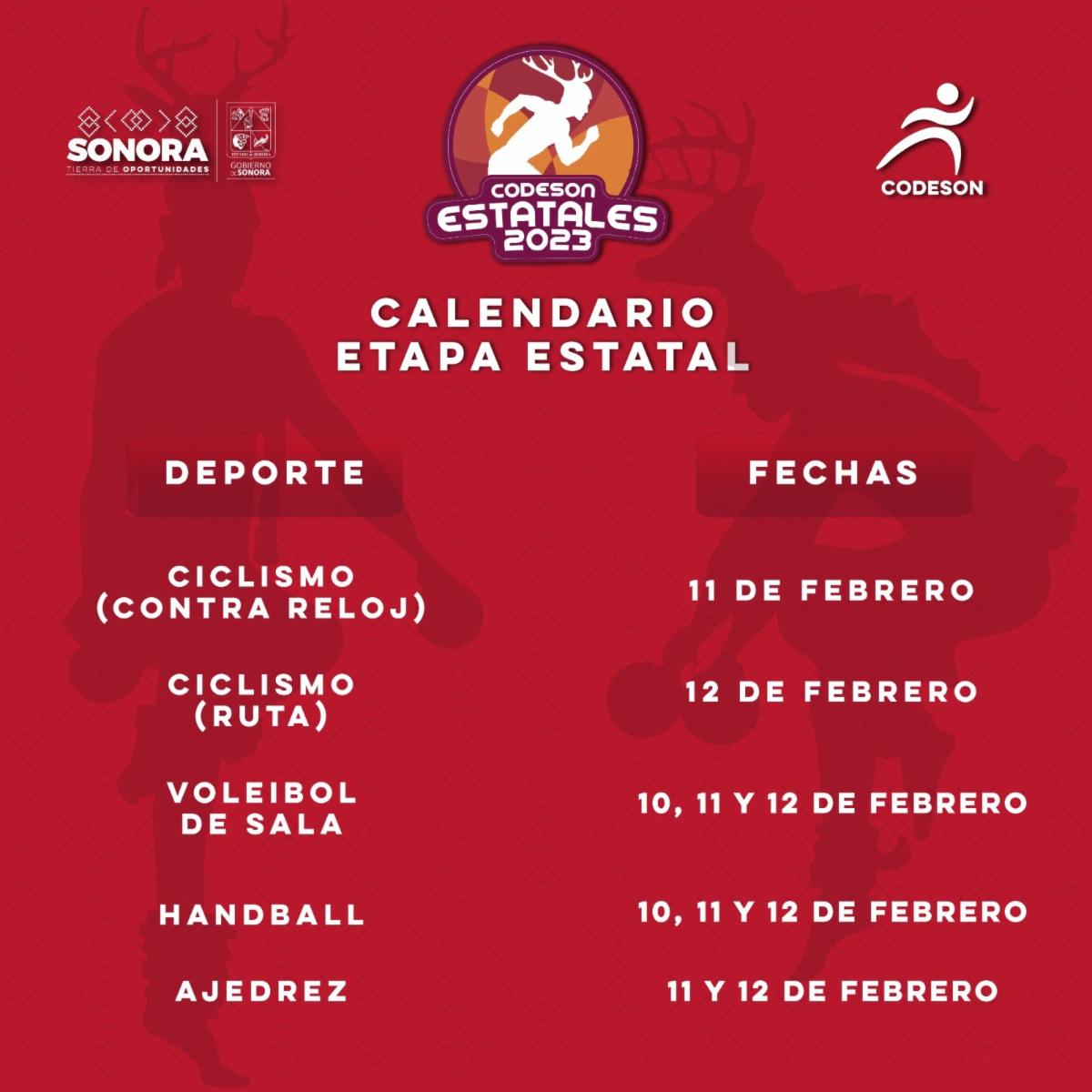 La siguiente etapa de los Estatales Codeson está pactada del 17 al 19 de febrero con las disciplinas de boxeo (Nogales), basquetbol (Caborca), softbol (Navojoa), karate do (Navojoa), tenis de mesa (Guaymas), volibol de playa (Guaymas), taekwondo (Hermosillo), levantamiento de pesas (Hermosillo) y judo (Hermosillo).
