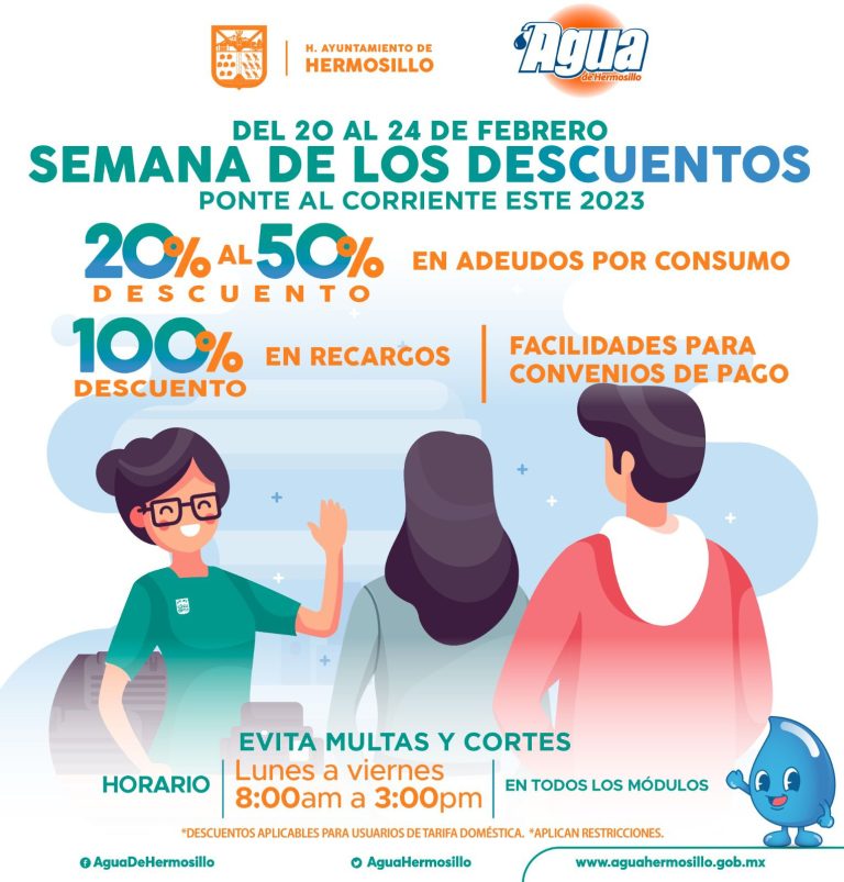 Con el objetivo de acercar a personas quienes cuentan con adeudos y desean regularizar su estatus para lograr beneficios de Usuario Cumplido, del 20 al 24 de febrero Agua de Hermosillo (AGUAH) realizará la Semana de los Descuentos.
