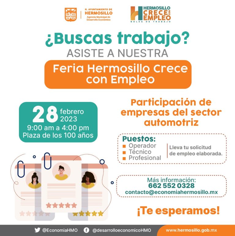 El próximo martes 28 de febrero a partir de las 9:00 horas la Plaza de los 100 años en el centro de Hermosillo será sede de la feria Hermosillo CRECE con Empleo, en la que se ofertarán 895 vacantes laborales a personas interesadas en ocuparlas, anunció Gertie Agraz Boeneker.