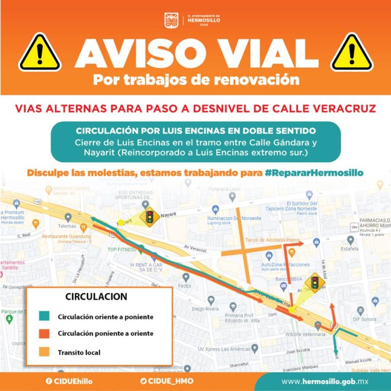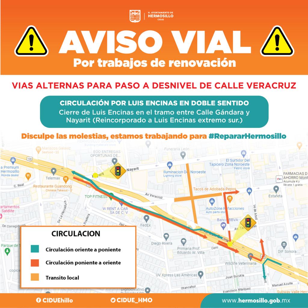 La titular de la Coordinación de Infraestructura, Desarrollo Urbano y Ecología (CIDUE), Astarté Corro Ruiz anunció el cierre del bulevar Luis Encinas por la modernización del paso a desnivel en la intersección con la avenida Veracruz, la cual iniciará el lunes 27 de febrero.