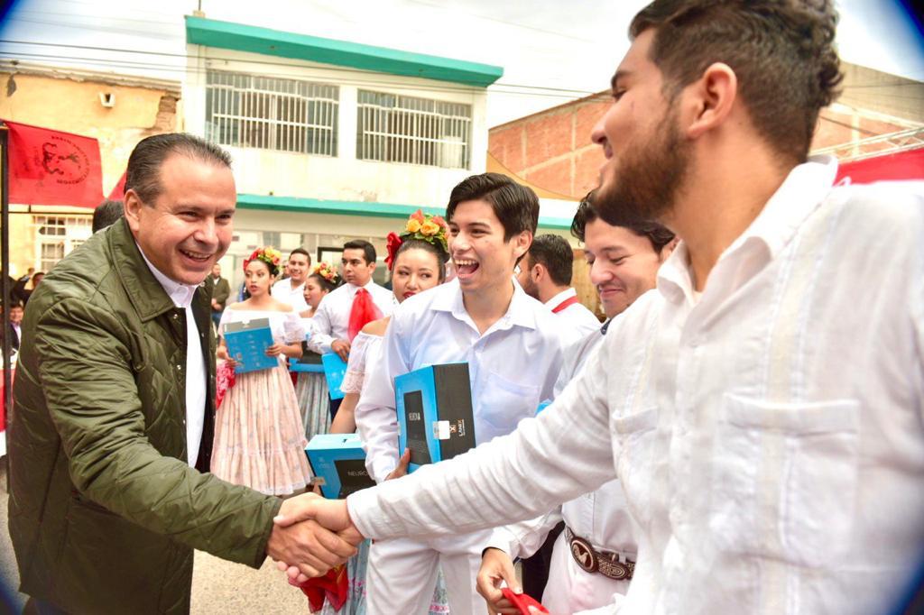 Junto al secretario del Ayuntamiento, Florencio Díaz Armenta, atendió la invitación a la ceremonia de inauguración celebrada al exterior de la Casa del Estudiante, durante la cual cumplió el compromiso de apoyar en la formación académica de jóvenes a través de la entrega de computadoras.