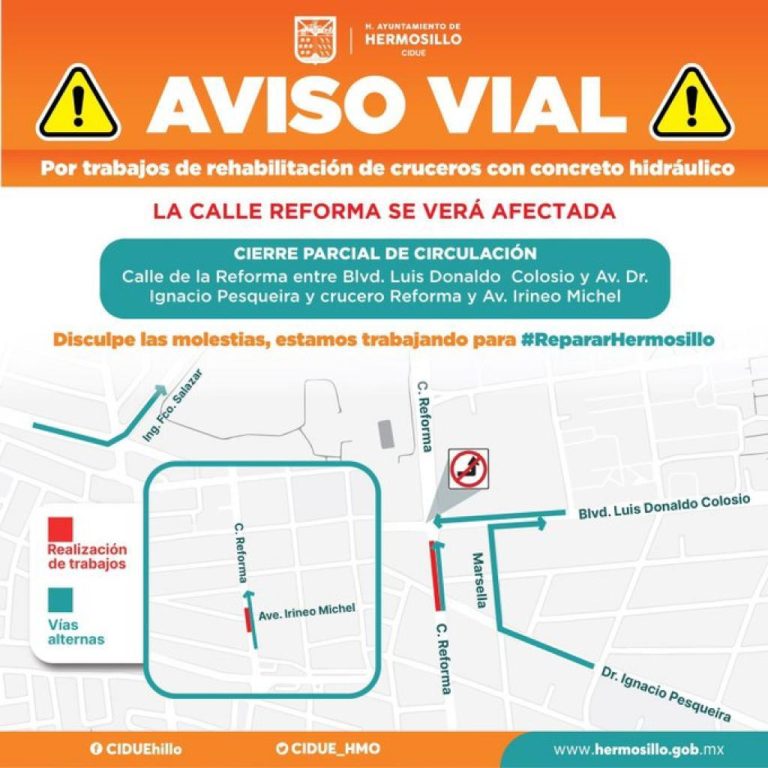 Desde este miércoles primero de marzo se reducirá la circulación vehicular a dos carriles por la rehabilitación con concreto hidráulico de la calle, a la altura de Irineo Michel, así como entre Colosio y Pesqueira