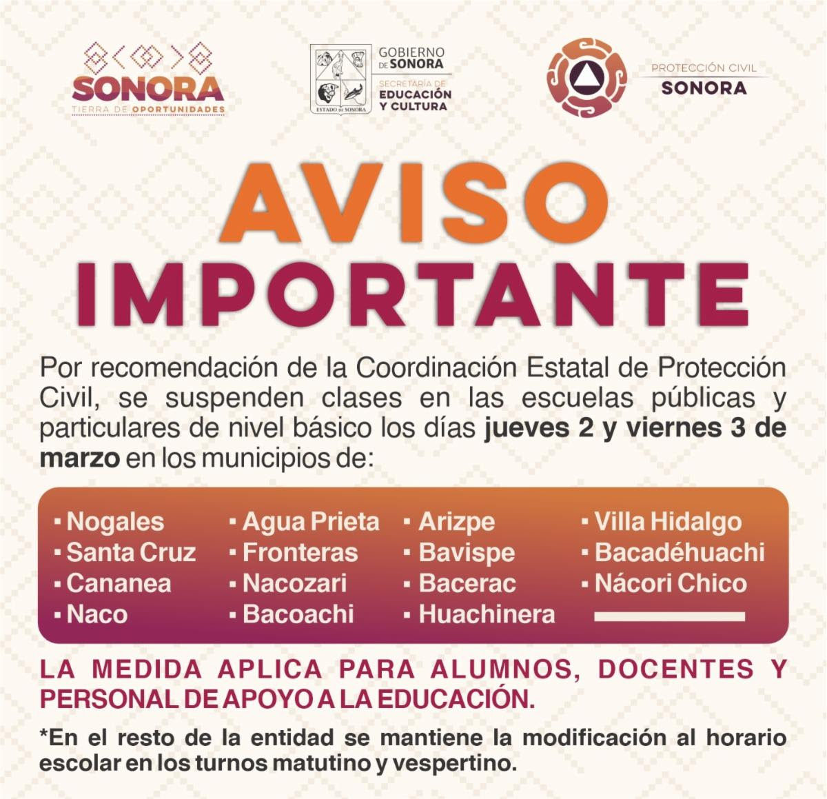 La SEC detalló que la medida aplicará el jueves 2 y viernes 3 de marzo para las escuelas públicas y particulares de nivel básico en Nogales, Santa Cruz, Cananea, Naco, Agua Prieta, Fronteras, Nacozari, Bacoachi, Arizpe, Bavispe, Bacerac, Huachinera, Villa Hidalgo, Bacadéhuachi y Nácori Chico.