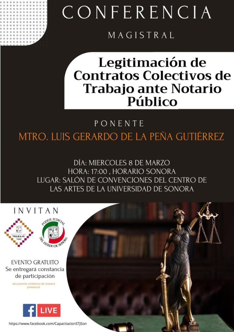 La Secretaria del Trabajo y el Poder Judicial del Estado de Sonora invitaron a la conferencia magistral “Legitimación de Contratos Colectivos de Trabajo ante Notario Público”, impartida por el maestro Luis Gerardo de la Peña Gutiérrez.