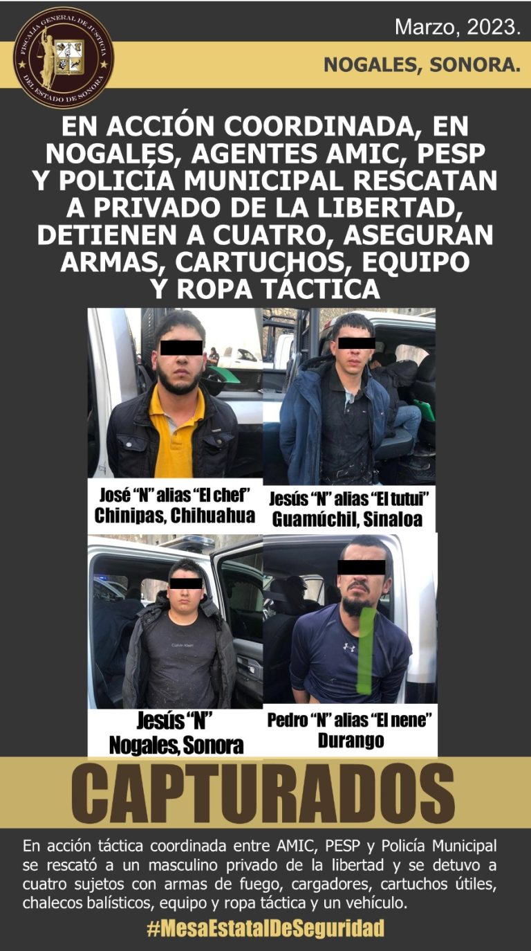 Nogales, Sonora, marzo 11 de 2023.- En acción táctica coordinada entre AMIC, PESP y Policía Municipal se rescató a un masculino privado de la libertad y se detuvo a cuatro sujetos con armas de fuego, cargadores, cartuchos útiles, chalecos balísticos, equipo y ropa táctica y un vehículo.