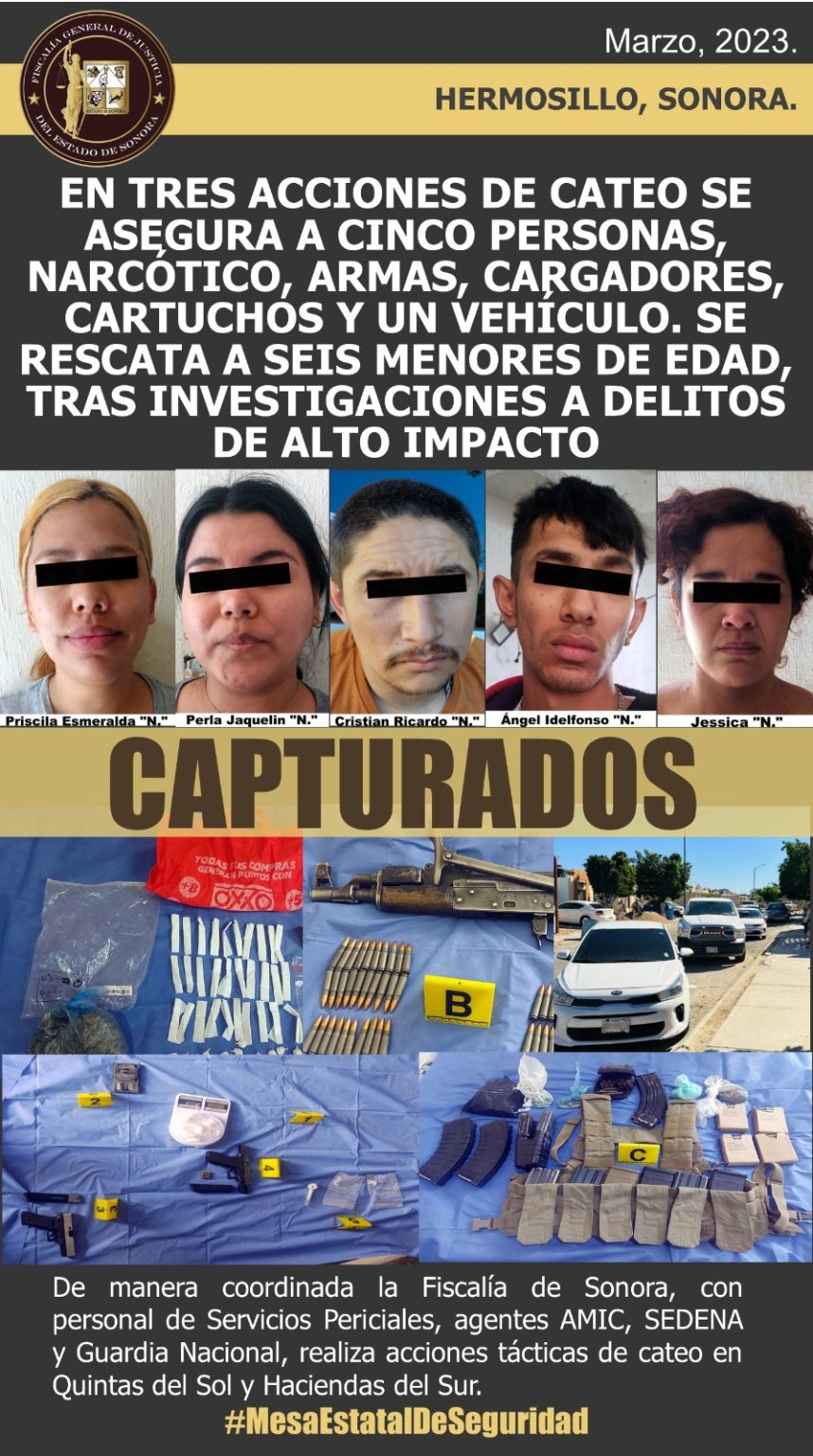 Como resultado de rápida respuesta a investigaciones por últimos delitos de alto impacto registrados en Hermosillo, en tres acciones tácticas de cateo coordinado por la Fiscalía de Sonora con AMIC, Peritos, así como elementos de SEDENA y Guardia Nacional, se aseguró a cinco personas, armas de fuego, cargadores, cartuchos, narcótico y un vehículo.