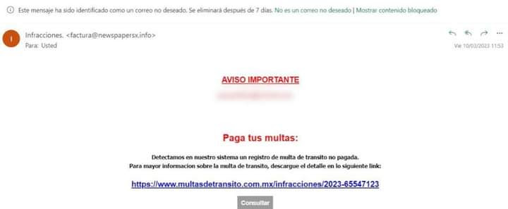 Las personas refirieron haber recibido un e-mail, notificándoles tenían multas pendientes, para lo cual les solicitaban ingresar a una liga adjunta para la revisión correspondiente.