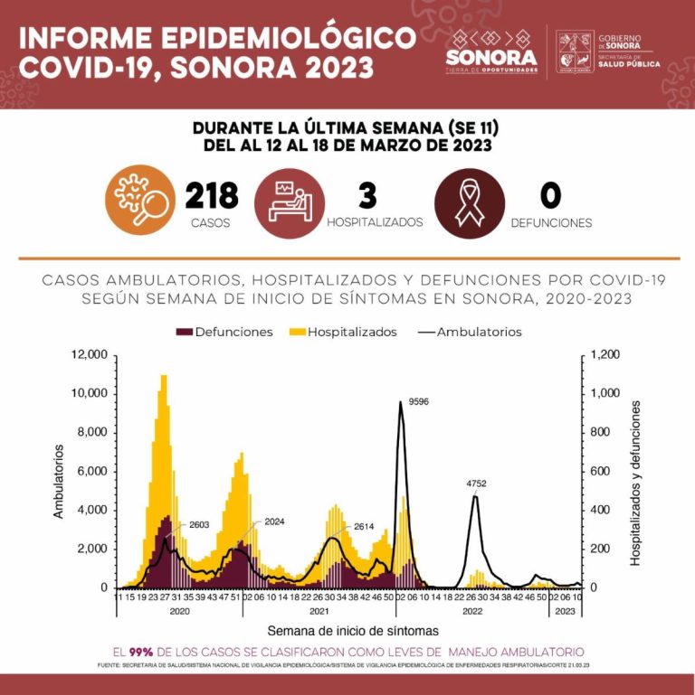 La Secretaría de Salud (SSA) del Gobierno de Sonora confirmó 218 nuevos casos de Covid-19 y cero defunciones, esto durante la semana epidemiológica (SE) 11, que abarca del 12 al 18 de marzo.