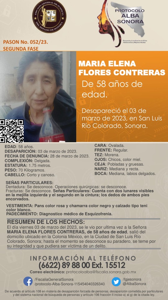 MARÍA ELENA FLORES CONTRERAS, de 58 años de edad desapareció el viernes 03 de marzo de 2023 en esta ciudad fronteriza. La denuncia fue interpuesta por su familia el pasado 28 de marzo al no saber de su paradero.