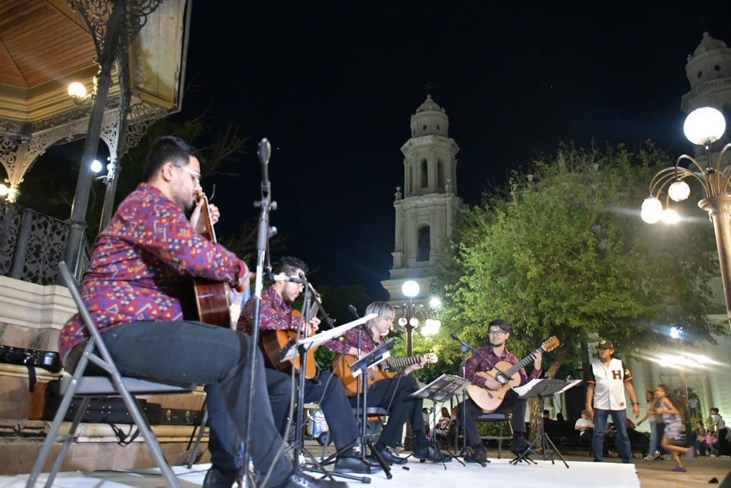 Para concluir la tarde de actividades, el cuarteto de guitarras Quasi Quinteto, integrado por Francisco Soqui, Marco Lamadrid, Juan Fernando Ramírez y Miguel Castillo, ofreció un concierto a las personas que asistieron a las actividades organizadas por el Gobierno Municipal en el centro histórico con la finalidad de fomentar la lectura y celebrar el talento que Hermosillo posee a través de sus autoras y autores.