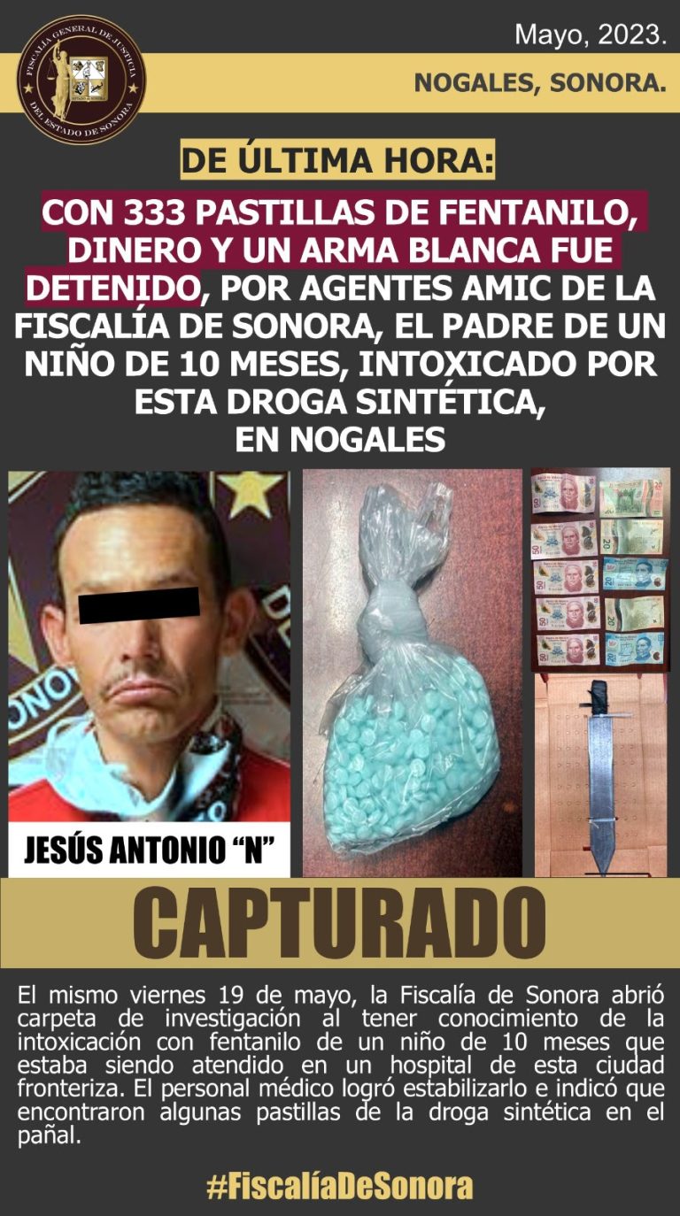 Con 333 pastillas de fentanilo, dinero y un arma blanca fue detenido, por agentes AMIC de la Fiscalía de Sonora, el padre de un niño de 10 meses, intoxicado por esta droga sintética, en Nogales