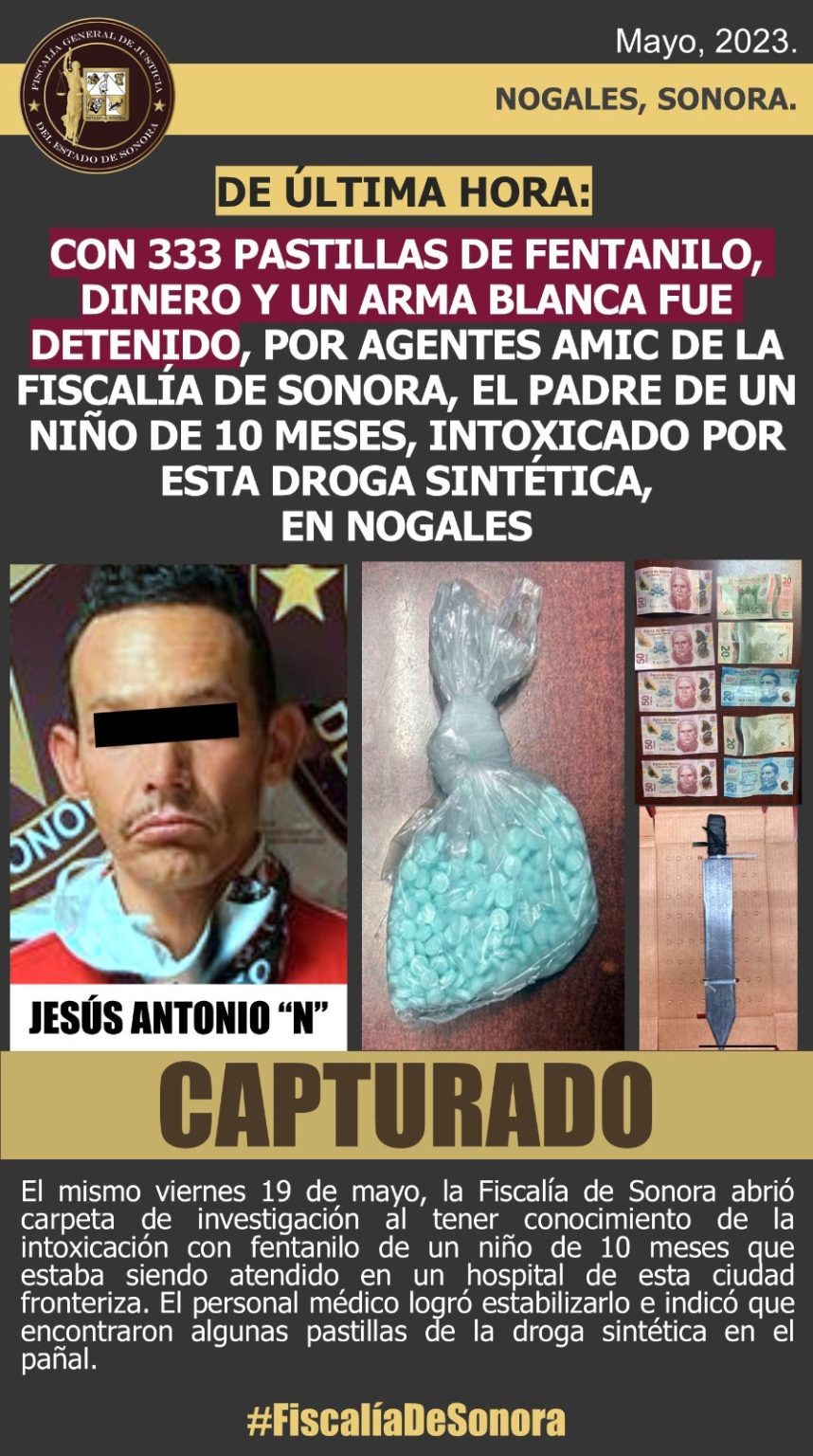 El mismo viernes 19 de mayo, la Fiscalía de Sonora abrió carpeta de investigación, al tener conocimiento de la intoxicación con fentanilo de un niño de 10 meses, que estaba siendo atendido en un hospital de esta ciudad fronteriza. El personal médico logró estabilizarlo e indicó que encontraron algunas pastillas de droga sintética en el pañal.