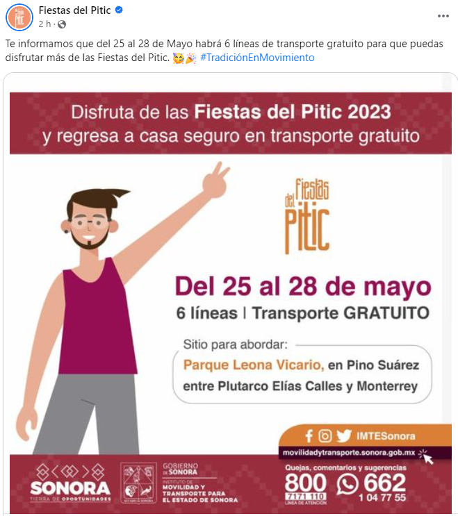 Hermosillo, Sonora; 24 de mayo de 2023.- El Gobierno de Sonora activará seis líneas de transporte para brindar servicio gratuito de movilidad al término de las actividades nocturnas de las Fiestas del Pitic 2023, con traslados seguros en camiones hacia las colonias.