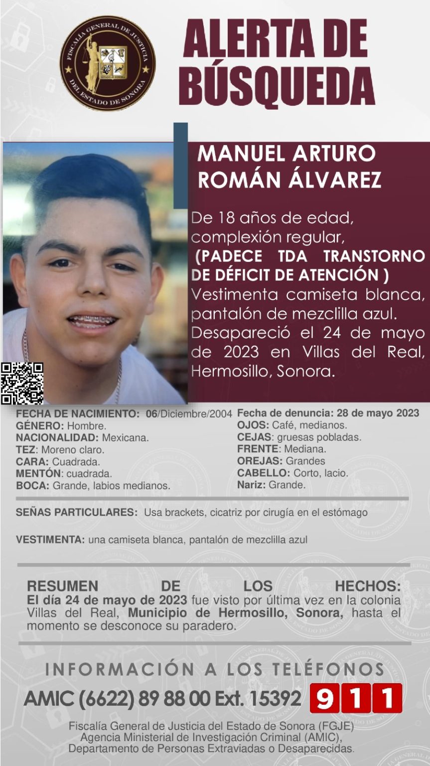 Activa la #FiscaliaDeSonora alerta de búsqueda para localizar a *Manuel Arturo Román Álvarez,* de 19 años de edad, quien padece trastorno de déficit de atención y desapareció de su domicilio en la colonia Villas del Real en Hermosillo, por la noche del pasado miércoles 24 de mayo.