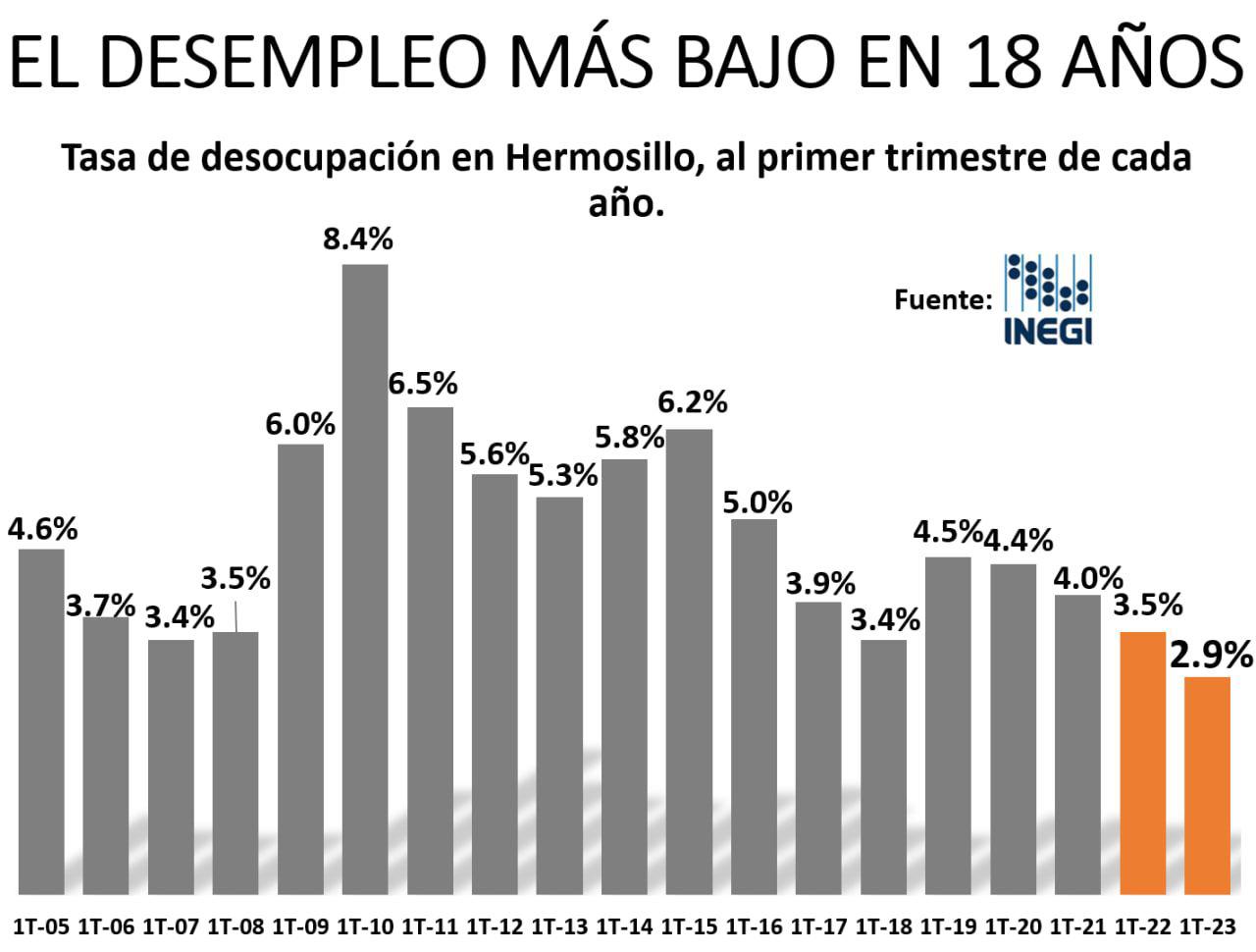 “En los últimos 18 años en la historia de la ciudad, que Hermosillo registra menos tasa de desempleo, es un 2.9 por ciento, y esto es una muy buena noticia y creo que al final no es otra cosa más que producto de certidumbre en la inversión y de que cuando el sector privado y el público caminan de la mano en la inversión se logran cosas importantes”, consideró.