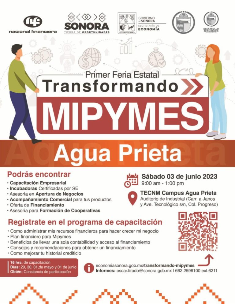 Para acercar a las grandes instituciones bancarias a los pequeños y medianos empresarios de Agua Prieta, así como dar a conocer programas de financiamiento y sistemas de capacitación con los que cuenta el Gobierno de Sonora, este sábado 3 de junio se realizará en esta ciudad la Primera Feria Estatal “Transformando Mipymes”.