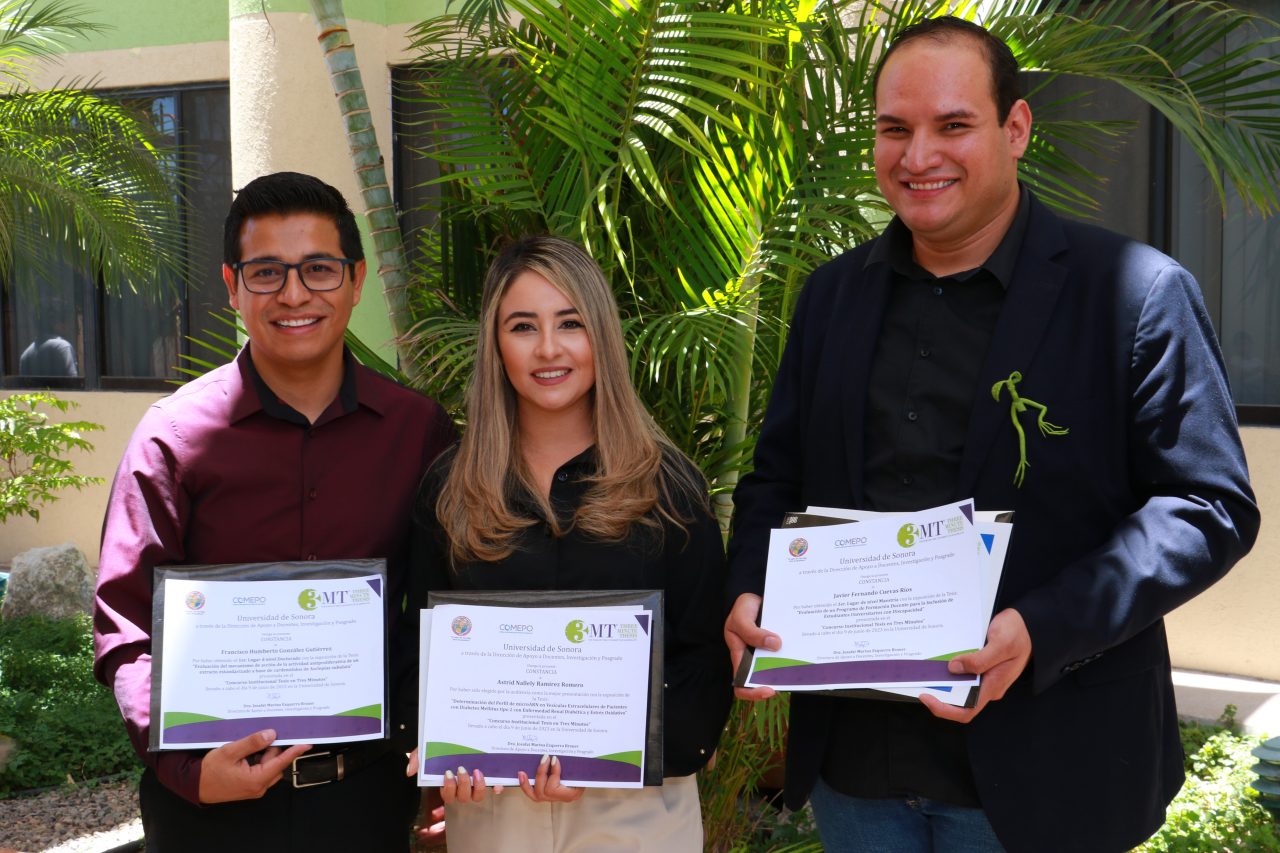 Astrid Nallely Ramírez Romero, Francisco Humberto González Gutiérrez y Javier Fernando Cuevas Ríos, estudiantes de doctorado y maestría, fueron los ganadores del Primer Concurso Institucional “Tesis en tres minutos” organizado por la Universidad de Sonora a través de la Dirección de Apoyo a Docentes, Investigación y Posgrado (DADIP).