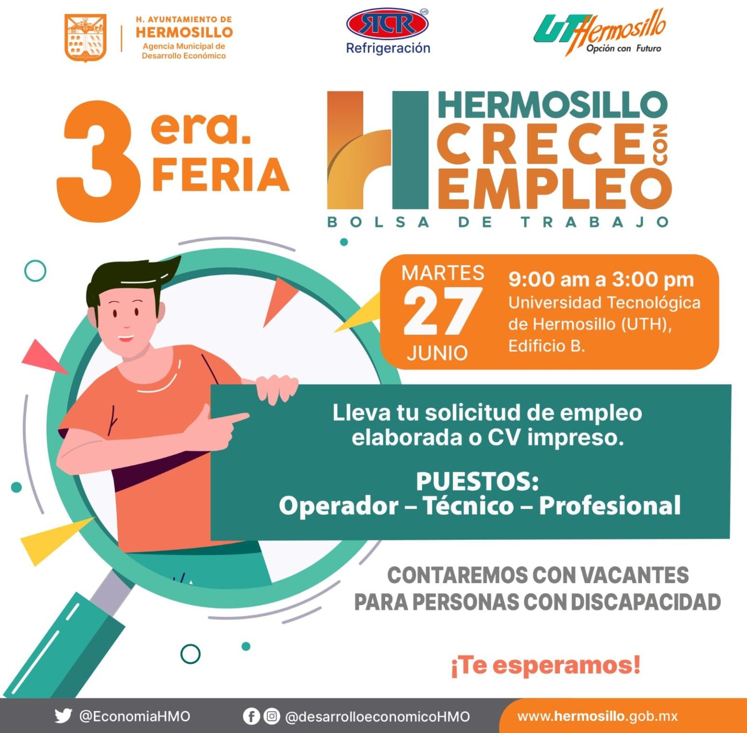 El Gobierno Municipal, a través de la Agencia Municipal de Desarrollo Económico (AMDE), prepara la tercera edición de la Feria Hermosillo CRECE con Empleo, a celebrarse el martes 27 de junio en las instalaciones de la Universidad Tecnológica de Hermosillo (UTH), anunció Gertie Agraz Boeneker.