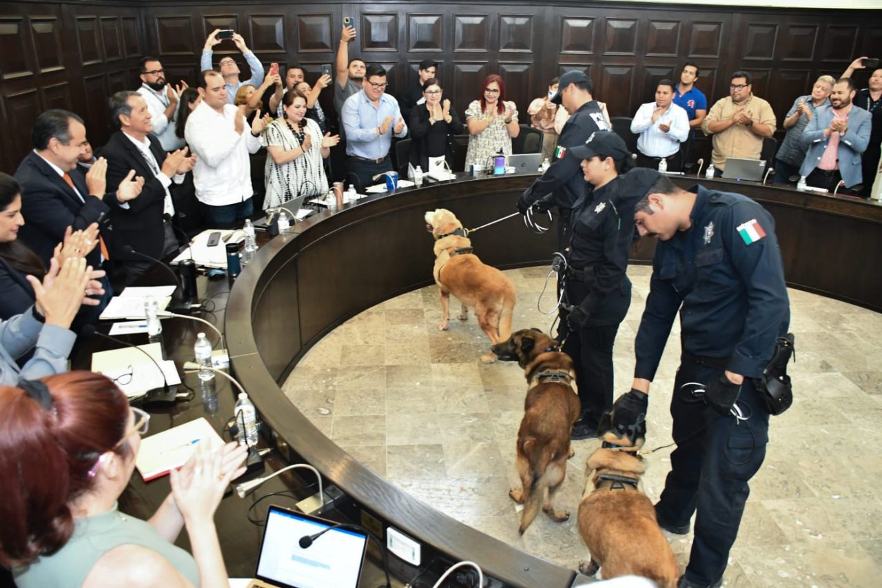 Con un fuerte aplauso de las y los integrantes de Cabildo, que encabeza el Presidente Municipal Antonio Astiazarán Gutiérrez, se reconoció a los agentes caninos K9 en retiro: Bubu, Buzz e Irka por su labor.