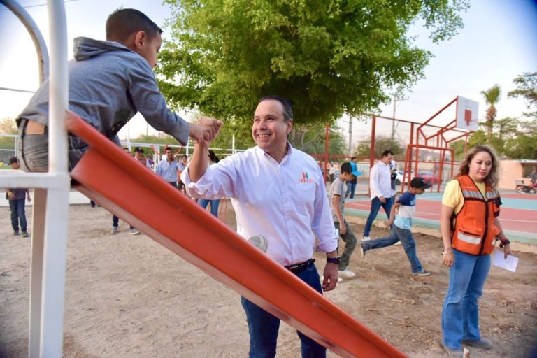 El Presidente Municipal celebró con familias de la colonia Virreyes, Mártires de Cananea y Primero Hermosillo la recuperación del parque cuyas instalaciones estaban en deterioro y que hoy cuentan con cancha de basquetbol reconstruida, área de futbol con nuevo pasto sintético, ejercitadores y mejoras a juegos infantiles, entre otros aspectos.