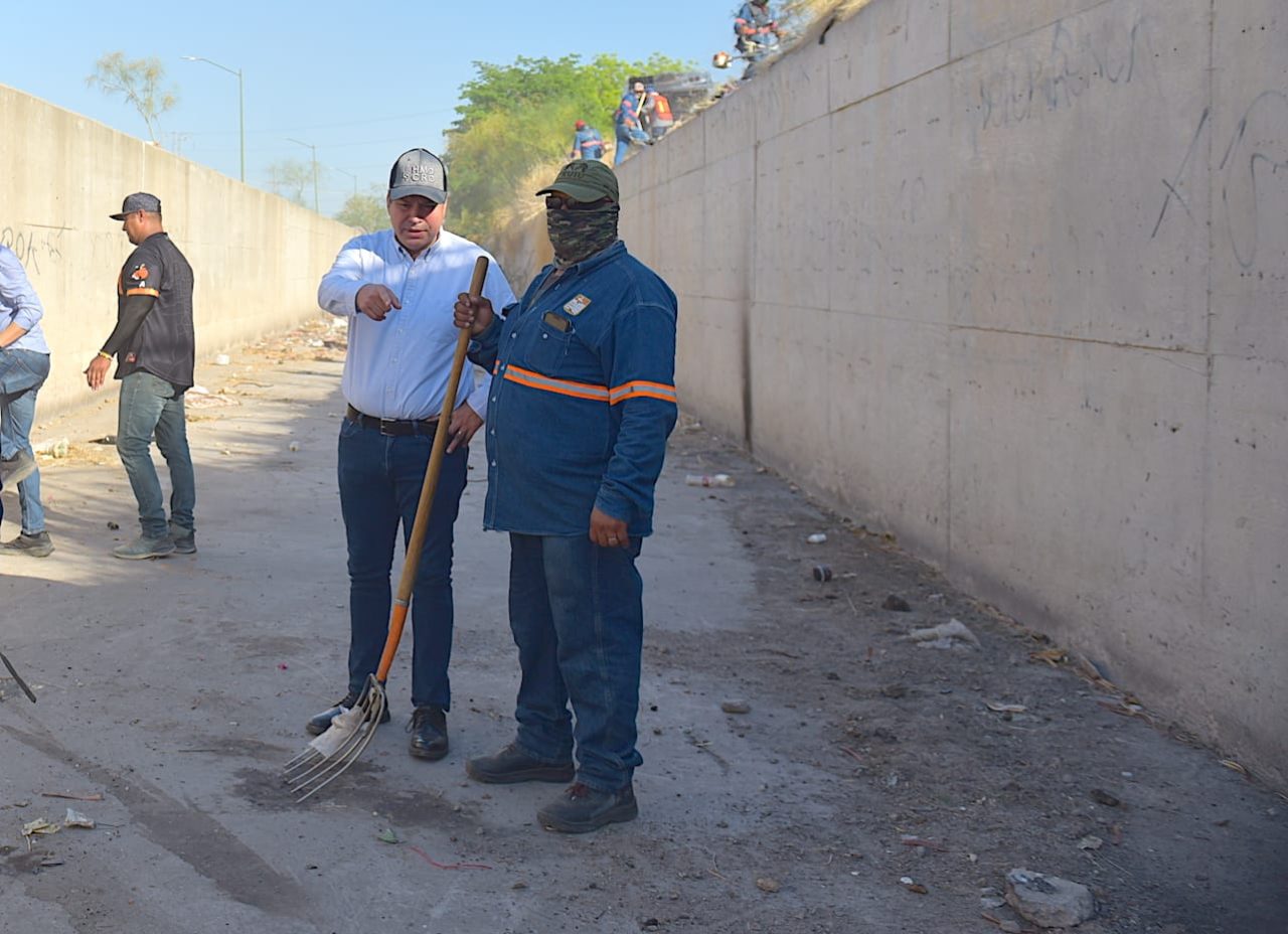 Acompañado por Sergio Pavlovich Escalante, director de Servicios Públicos Municipales, visitó el tramo embovedado del canal Lázaro Cárdenas donde la mañana de este miércoles se desarrollaba un intenso operativo de limpieza, tanto en su interior, los conductos de desfogue que lo alimentan y sus áreas laterales.