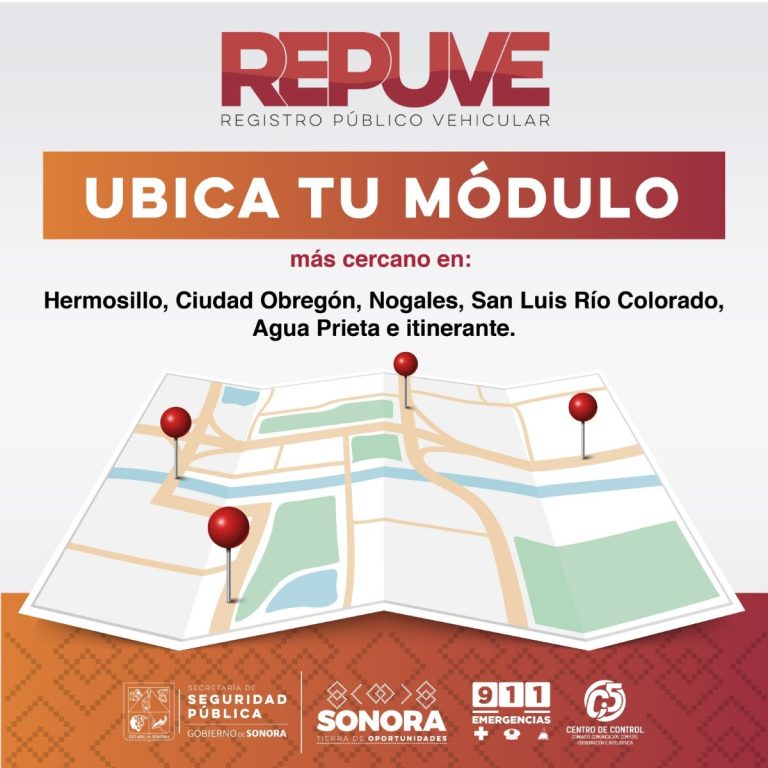 La dependencia estatal informó que los módulos del Registro Público Vehicular (Repuve) se encuentran listos en Hermosillo, Ciudad Obregón, Nogales, San Luis Río Colorado y Agua Prieta para atender las solicitudes de la ciudadanía interesada en realizar este trámite. Y, de requerirse en algún otro municipio, se encuentra disponible un módulo itinerante.