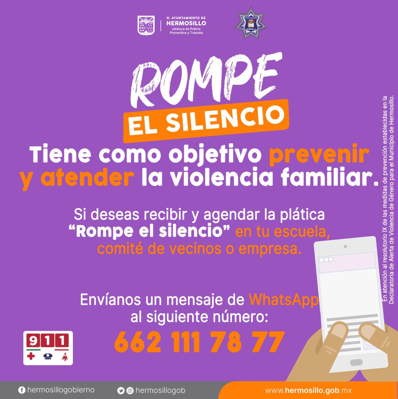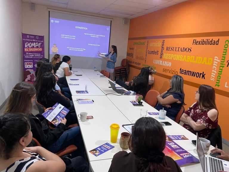 Hermosillo, Sonora; 30 de julio, 2023.- El programa de prevención de violencia familiar de DIF Hermosillo y la Policía Municipal «Rompe el Silencio» se impulsa en empresas, comercios y universidades a través de pláticas y talleres.
