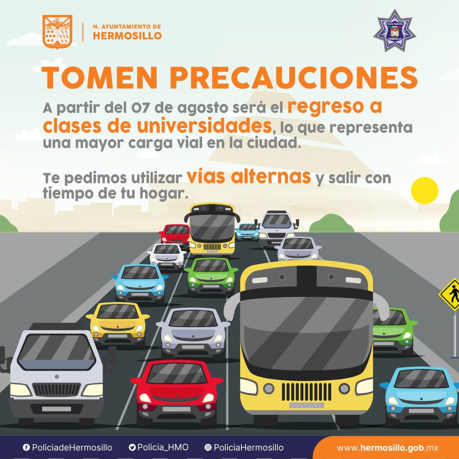 Hermosillo, Sonora a 06 de agosto del 2023.- El Departamento de Tránsito Municipal realizará operativos para inhibir accidentes viales ante el regreso a clases de universidades y servidores públicos de los tres niveles de gobierno.