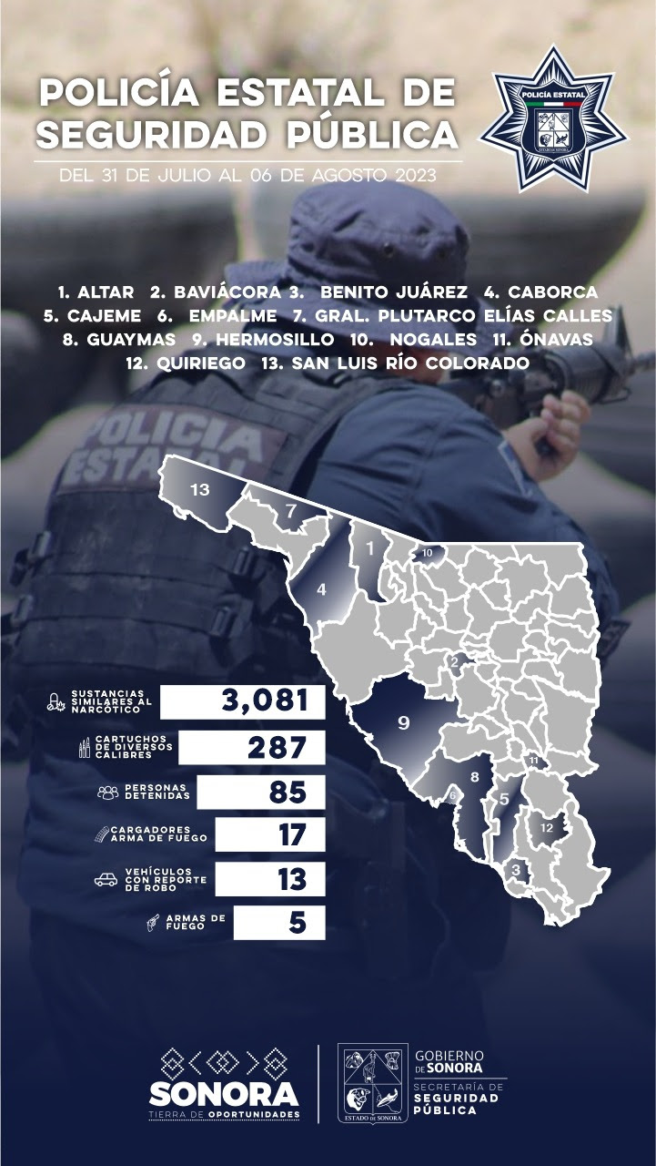 En la semana del 31 de julio al 06 de agosto, los policías estatales generaron resultados principalmente en Hermosillo, Cajeme, Empalme, Guaymas, Benito Juárez, San Luis Río Colorado, Quiriego, Altar, Nogales, Ónavas, General Plutarco Elías Calles, Baviácora, Caborca, entre otros, donde han registrado el aseguramiento de 85 personas en flagrancia.