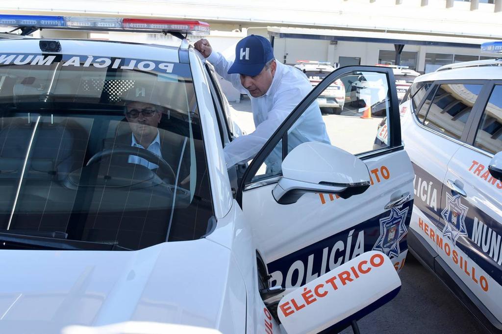 El embajador Jon Benjamín participó en un recorrido por la electrolinera de la Comandancia Norte, donde se cargan 120 de las 220 que conforman la flota de patrullas eléctricas y a las que se suman 80 de gasolina. Se integró a la comitiva la regidora Ana María Araque.