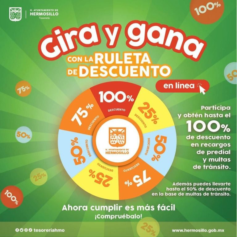Hermosillo, Sonora; 11 de agosto, 2023.- Para facilitar a ciudadanos y ciudadanos ponerse al corriente en adeudos de contribuciones municipales, Tesorería Municipal de Hermosillo dispuso la Ruleta del Descuento en Línea.