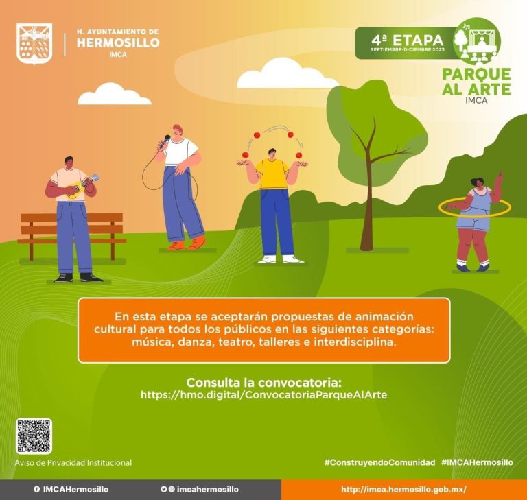 La convocatoria estará abierta hasta el próximo viernes 18 de agosto de 2023, a las 15:00 horas y se puede consultar en las redes sociales del IMCA y de HermosilloGob, así como en el siguiente link: https://hmo.digital/ConvocatoriaParqueAlArte
