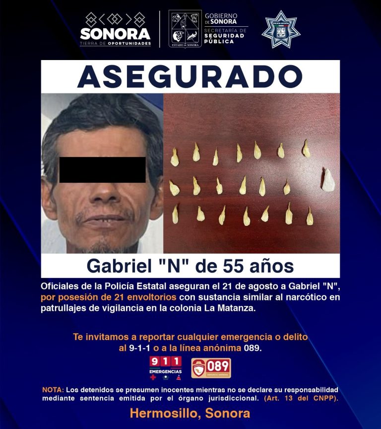 Alrededor de las 17:00 horas del lunes 21 de agosto, en el callejón Augusto César Sandino, de la colonia La Matanza, la PESP aseguró a Gabriel «N», de 55 años de edad, cuando intentó evadir su arresto arrojando una bolsa donde llevaba 21 envoltorios de sustancias prohibidas.
