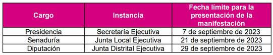 Las fechas límite por cargo son: 7 de septiembre de 2023 para Presidencia, 21 de septiembre para Senadurías y 29 de septiembre para Diputaciones