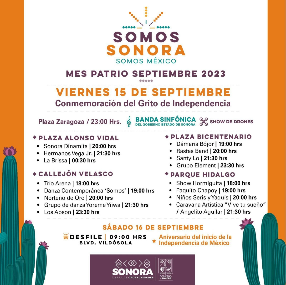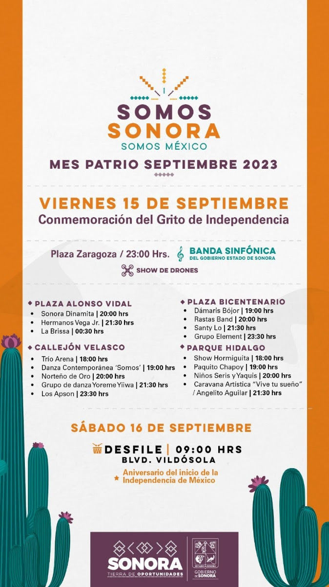 “Invitamos a todas y todos los sonorenses a que nos acompañen a esta magnífica celebración desde las seis de la tarde, en los alrededores de Palacio de Gobierno, donde encontrarán stands de comida, área para niños y foros artísticos y culturales”, indicó.