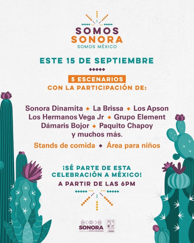 “Invitamos a todas y todos los sonorenses a que nos acompañen a esta magnífica celebración desde las seis de la tarde, en los alrededores de Palacio de Gobierno, donde encontrarán stands de comida, área para niños y foros artísticos y culturales”, indicó.