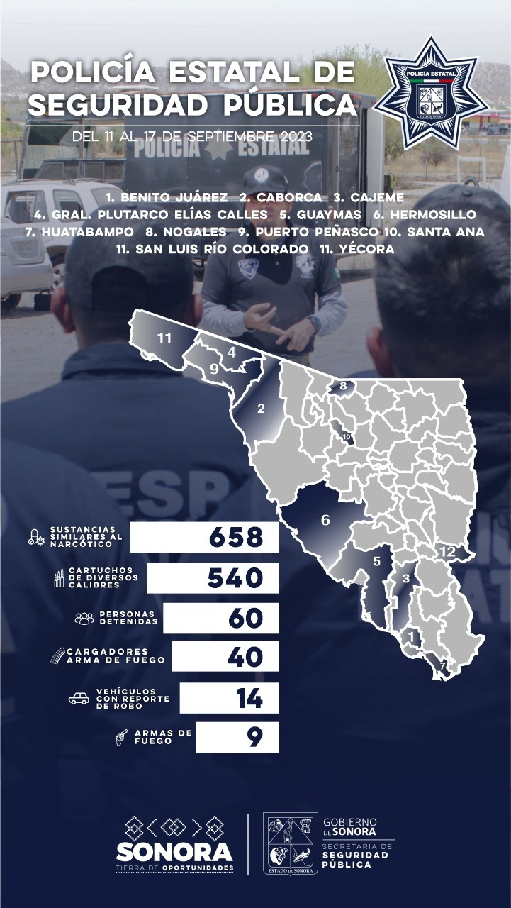 Estos resultados se generaron principalmente en Hermosillo, Cajeme, Huatabampo, Guaymas, Nogales, Benito Juárez, San Luis Río Colorado, Santa Ana, Yécora, Gral. Plutarco Elías Calles, Puerto Peñasco, Caborca, entre otros, sin embargo, la corporación tiene patrullajes de vigilancia en el resto de los municipios para atender la denuncia y promover la proximidad ciudadana.