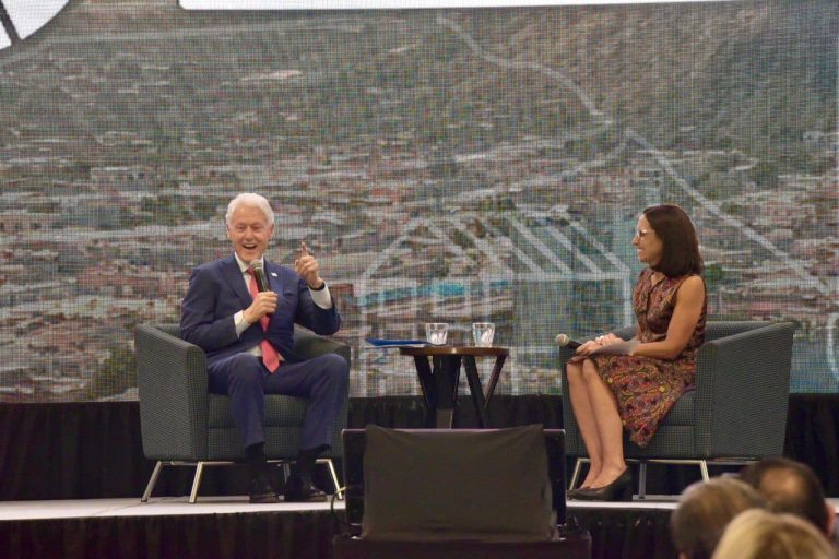 En el conversatorio magistral moderado por Tania Ortiz Mena, presidenta de la compañía Sempra Infraestructura, especialista en desarrollo, construcción y operación de infraestructura energética, Clinton felicitó a Antonio Astiazarán porque Hermosillo es líder en el uso de energías limpias al contar con  220 patrullas eléctricas, muchas más incluso que en Nueva York o en cualquier lugar del mundo.