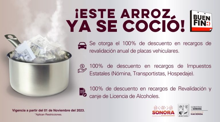 El director general de Recaudación de la Secretaría de Hacienda, Jorge Iván de la Rosa Flores informó que, a partir del 1 de noviembre, el Gobierno de Sonora dará inicio al «Buen Fin» lo que permitirá a las familias sonorenses, comercios e industrias establecidas en el estado ponerse al corriente y cumplir con sus obligaciones fiscales.