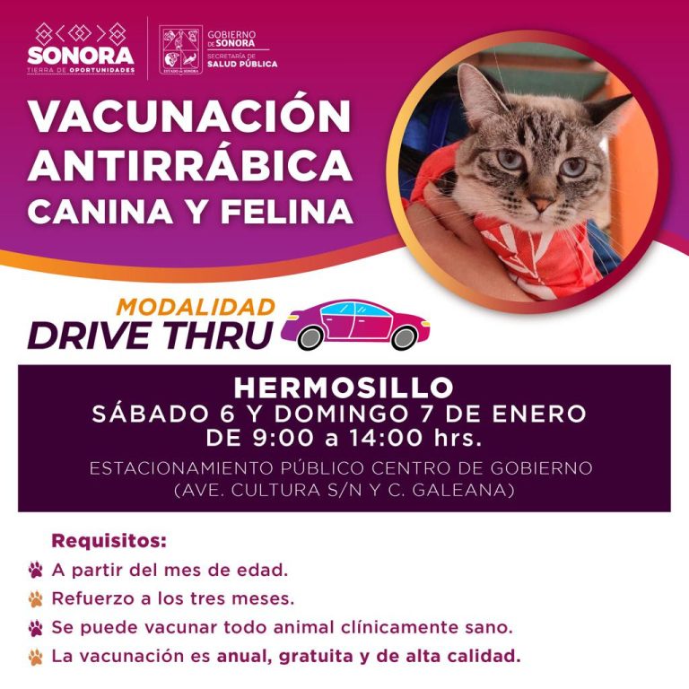 El Gobierno de Sonora a través de la Secretaría de Salud (SSA) arrancará con la primera jornada de vacunación antirrábica con modalidad drive thru, donde estarán disponible tres mil 500 dosis para perros y gatos.