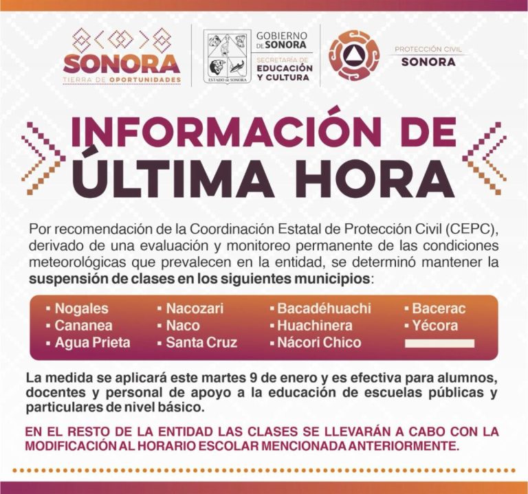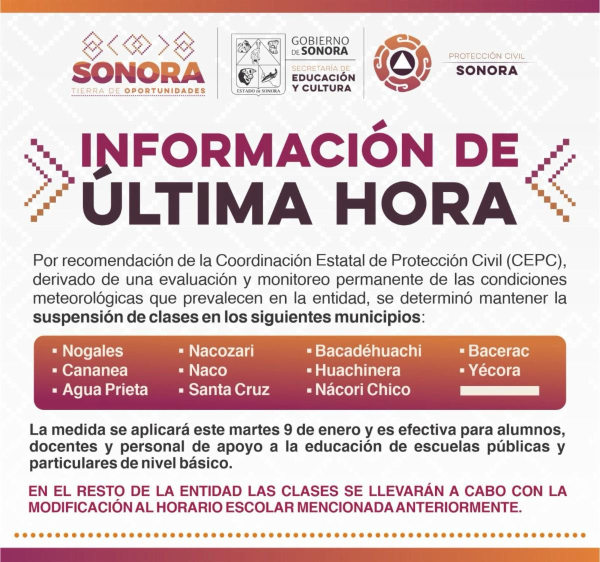Por recomendación de la Coordinación Estatal de Protección Civil (CEPC), derivado de una evaluación y monitoreo permanente de las condiciones meteorológicas que prevalecen en la entidad, se determinó mantener la suspensión de clases en Nogales, Cananea, Agua Prieta, Nacozari, Naco, Santa Cruz, Bacadéhuachi, Huachinera, Nácori Chico, Bacerac y Yécora.